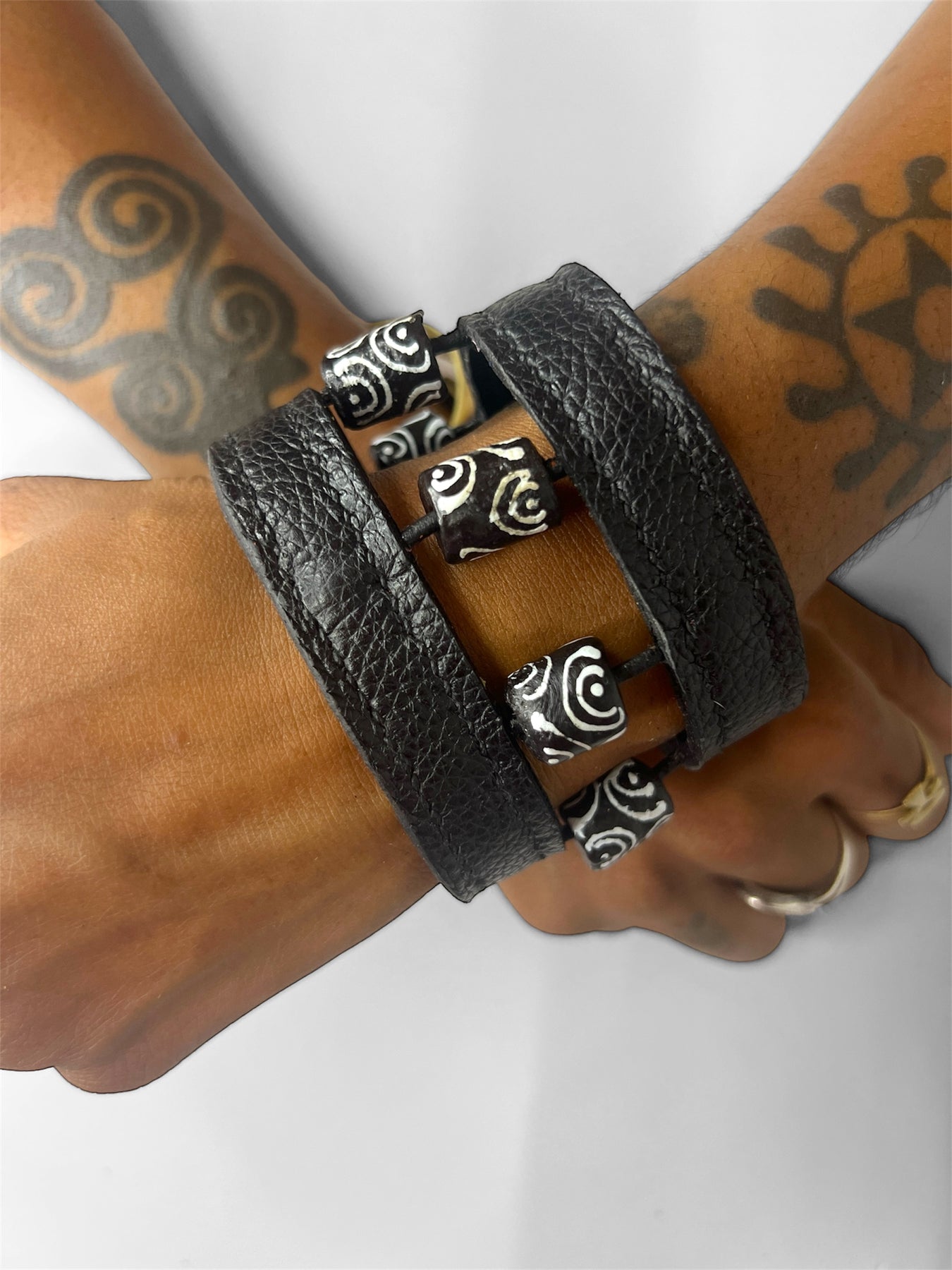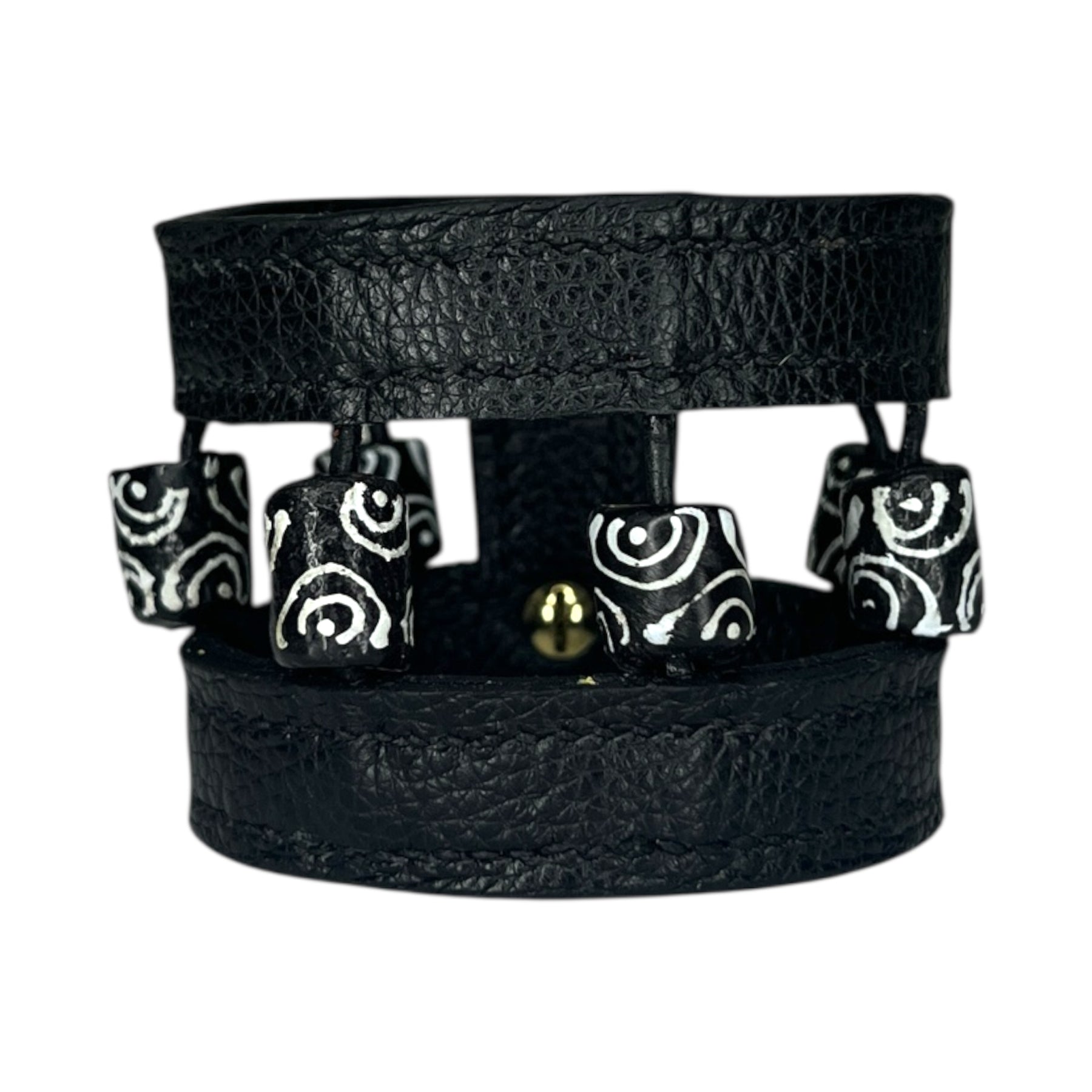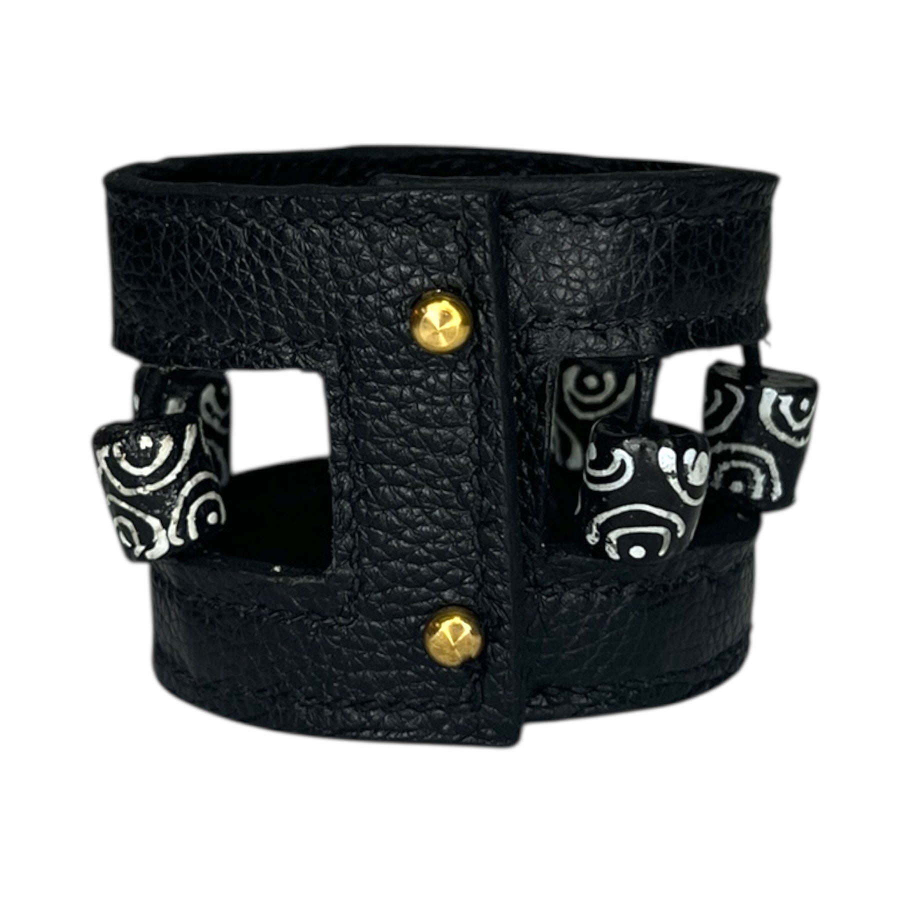 Manchette en cuir avec des perles du Ghana – Cousue main